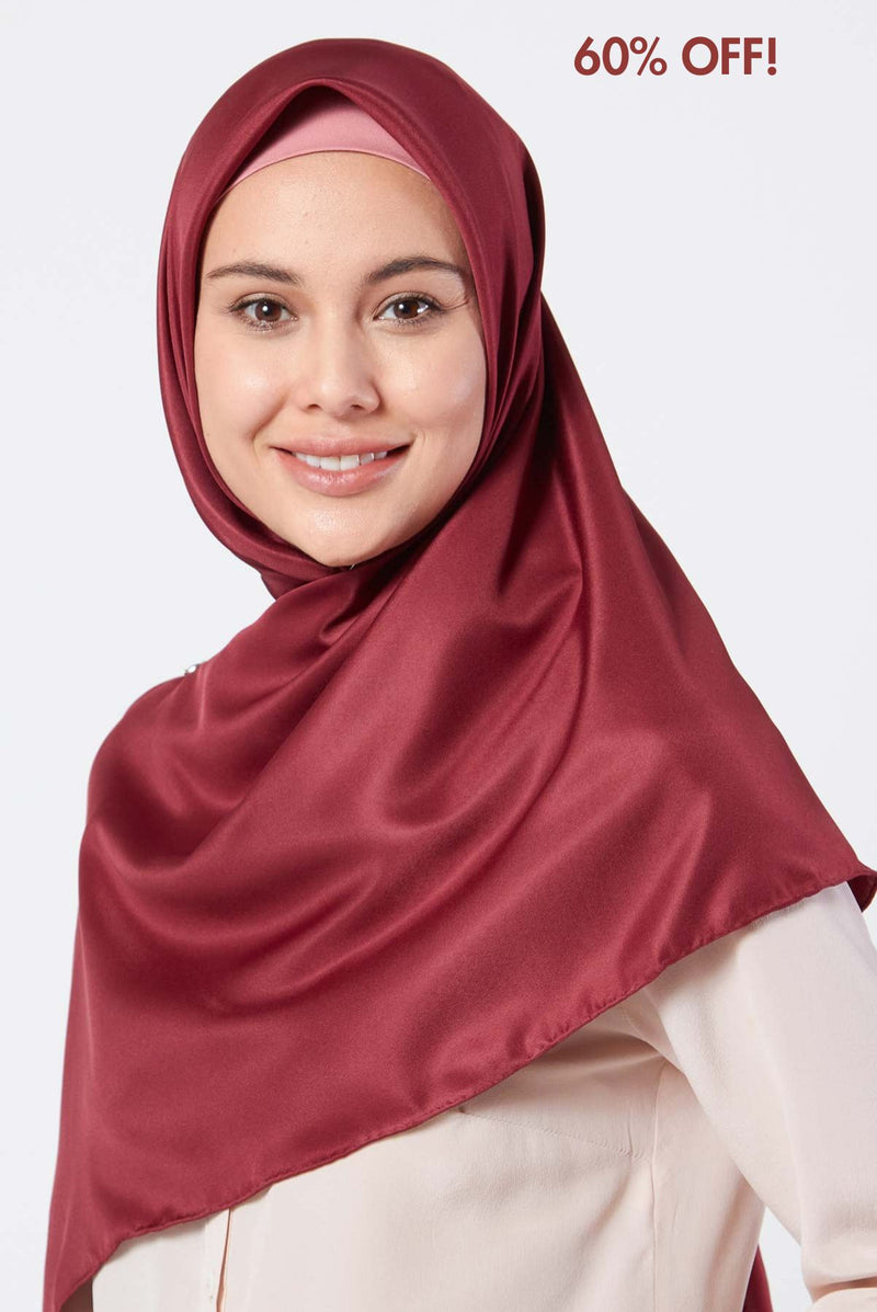 The exact maroon shade that i want. This is a really large square shawl as its name.U may get the combination of twill and satin feels, it thick but airy with matte shine. Wont give u headache. So easy to iron and shape,it doesnt glide as per normal satin shawl.even with brooch usage, it doesnt damage the thread gap as the twill silk.